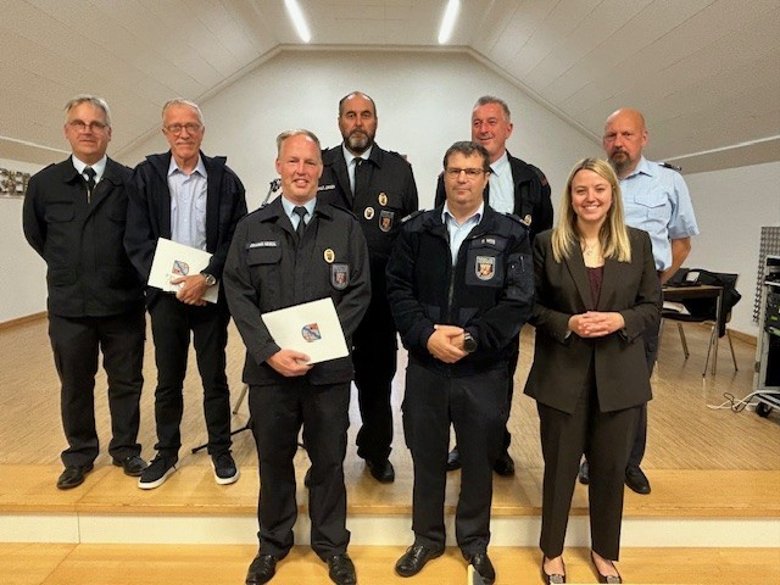 Das Bild zeigt die Betroffenen mit der Wehrleitung und Bürgermeisterin Anna Carina Krebs.
